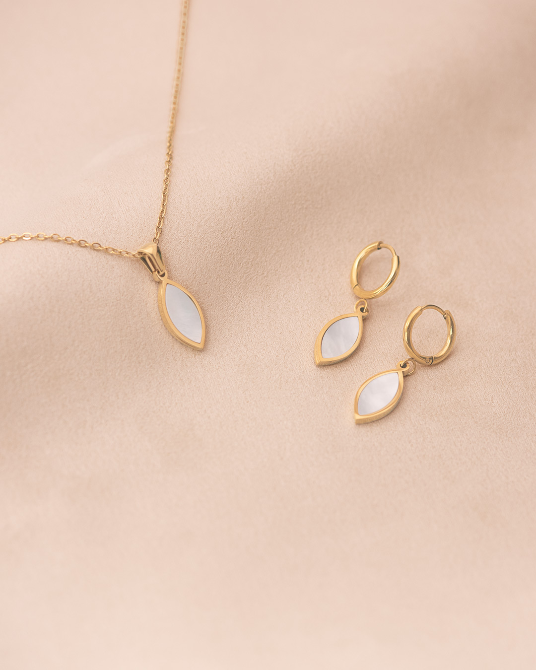 A refined set featuring a marquise-shaped pendant paired with matching hoop earrings. The soft white stone sits inside a slim gold frame, creating a gentle contrast between glow and warmth. The pendant rests lightly on a fine chain, while the small hoops hold the same marquise drops for a coordinated look. Smooth and easy to wear, this set adds a beautiful glow whether worn during the day or for an evening out.
