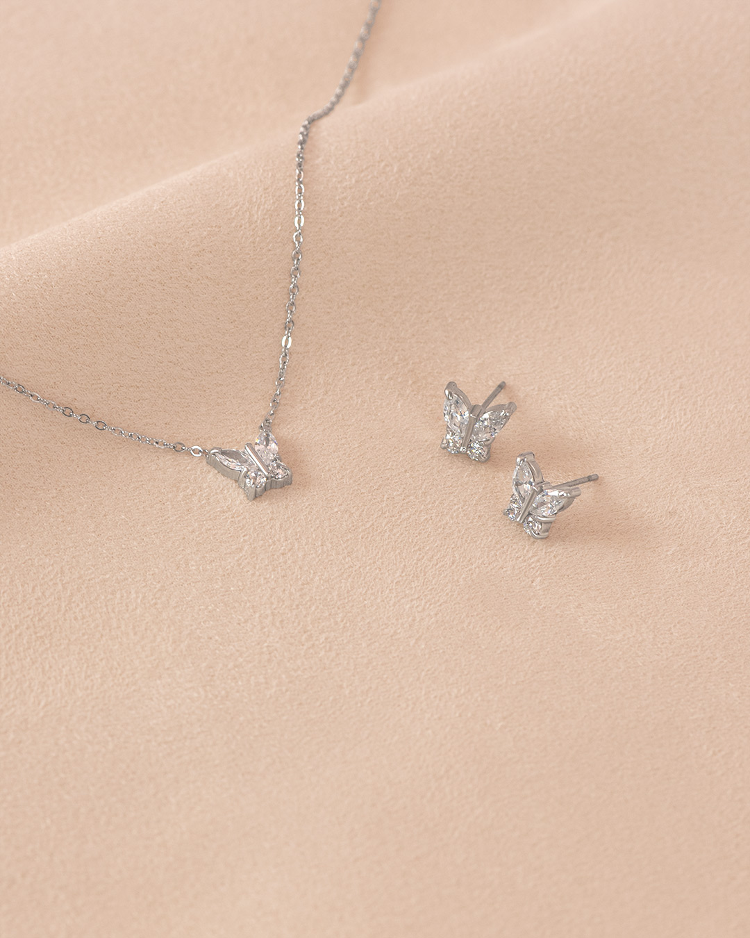 A graceful butterfly-inspired necklace and stud set designed to sparkle. Each piece features a single butterfly adorned with marquise-cut stones forming the upper wings and round brilliant stones shaping the lower wings, creating a beautiful contrast of sharp elegance and soft shimmer.
