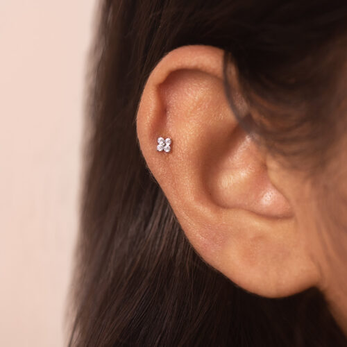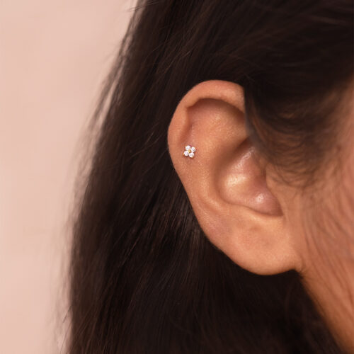 A petite stud shaped like a four-petal flower, with each petal formed by a clear stone and a slightly smaller stone at the center. Its delicate shape brings a soft charm to any look, suitable for the main lobe, upper lobe, helix, other upper ear piercings, or as a floral nose pin.