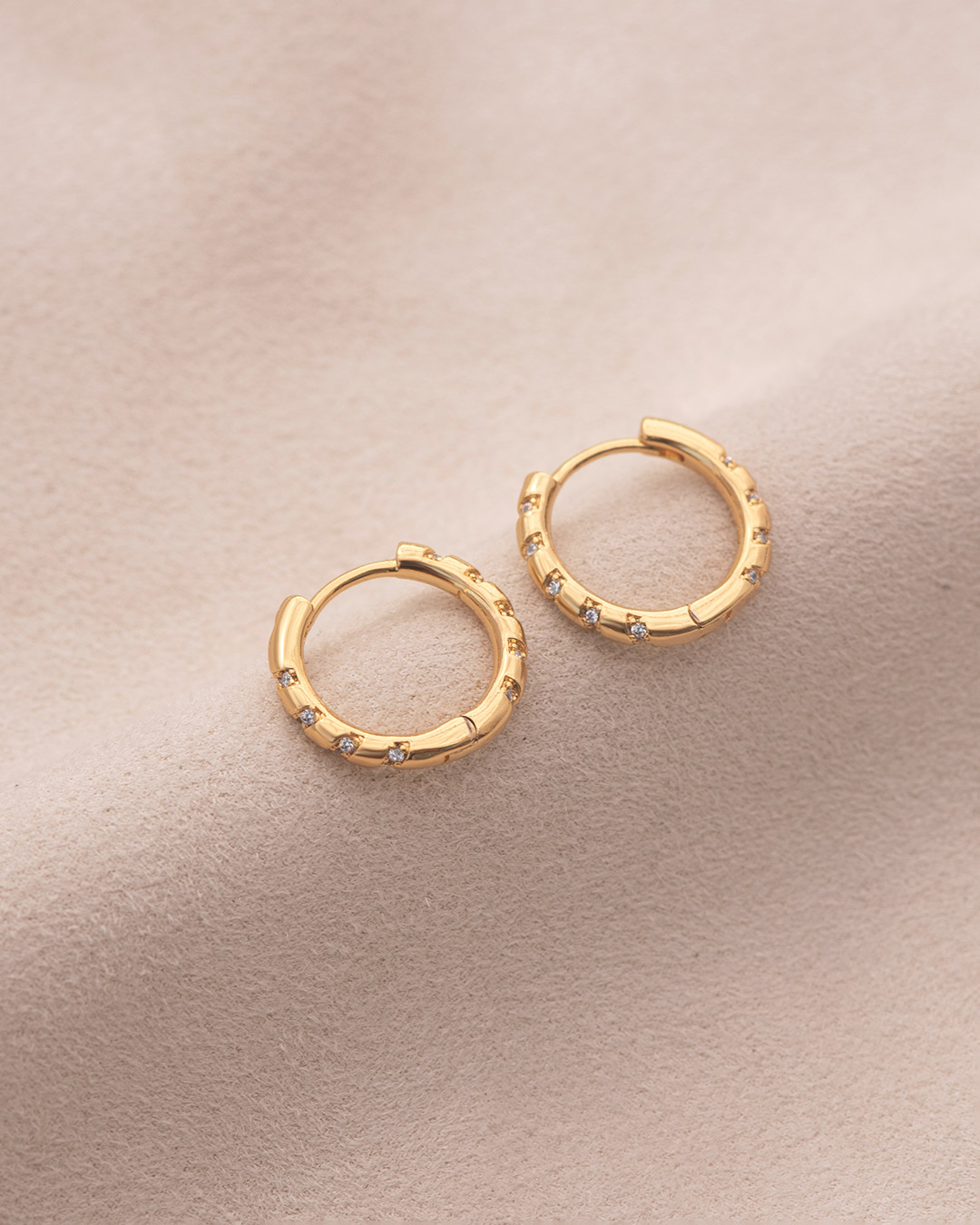 These hoops have a clean gold finish with small stone details spaced along the curve. The design feels light on the ear and easy to wear, making them a go-to option for both casual outfits and dressed-up moments.