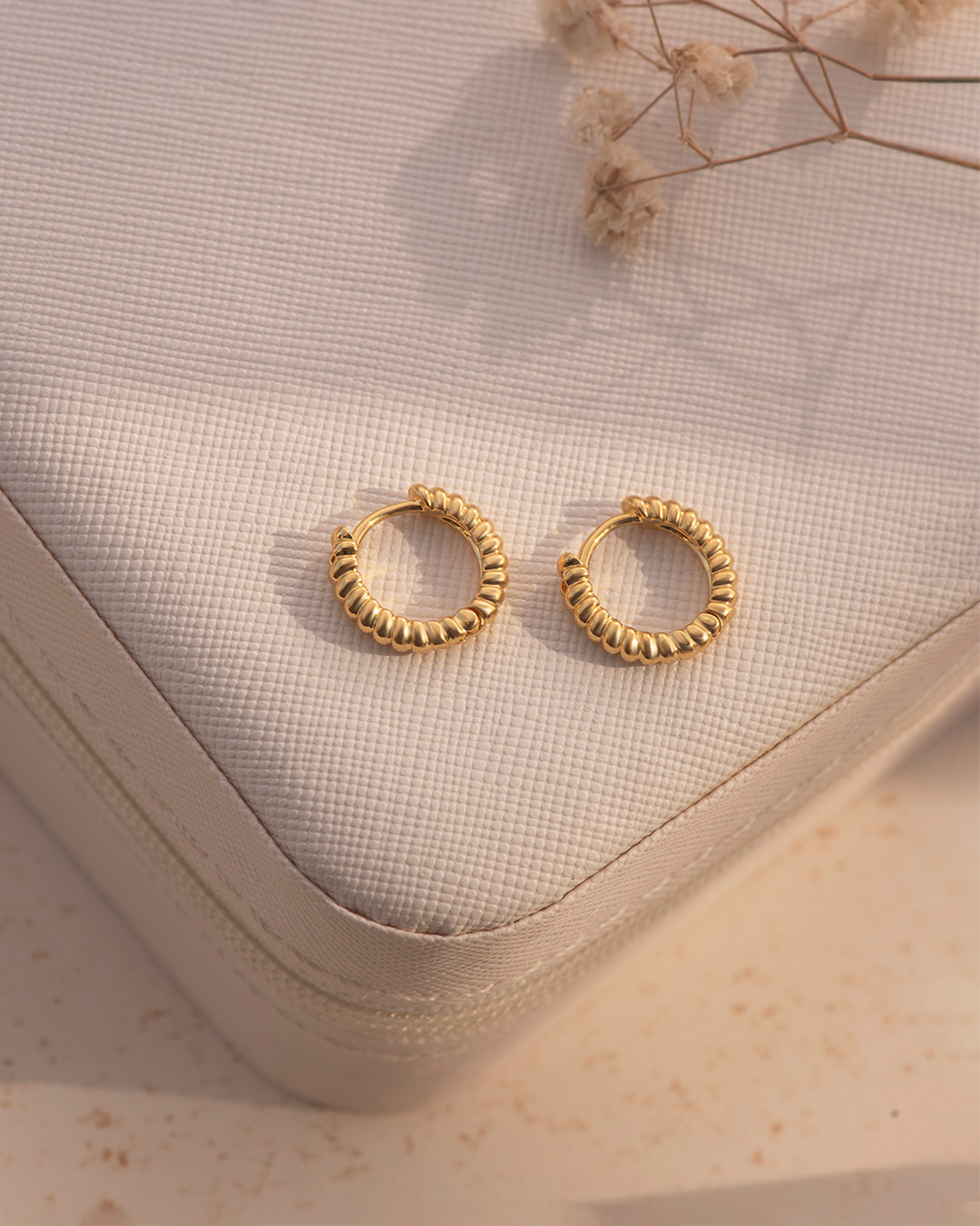 These small gold hoops feature a rounded, ridged texture that runs all the way around the hoop, creating a soft play of light with every movement. The raised pattern adds depth while keeping the overall look clean and easy to wear. The compact size makes these hoops sit flush against the earlobe without much play providing a sharp look.