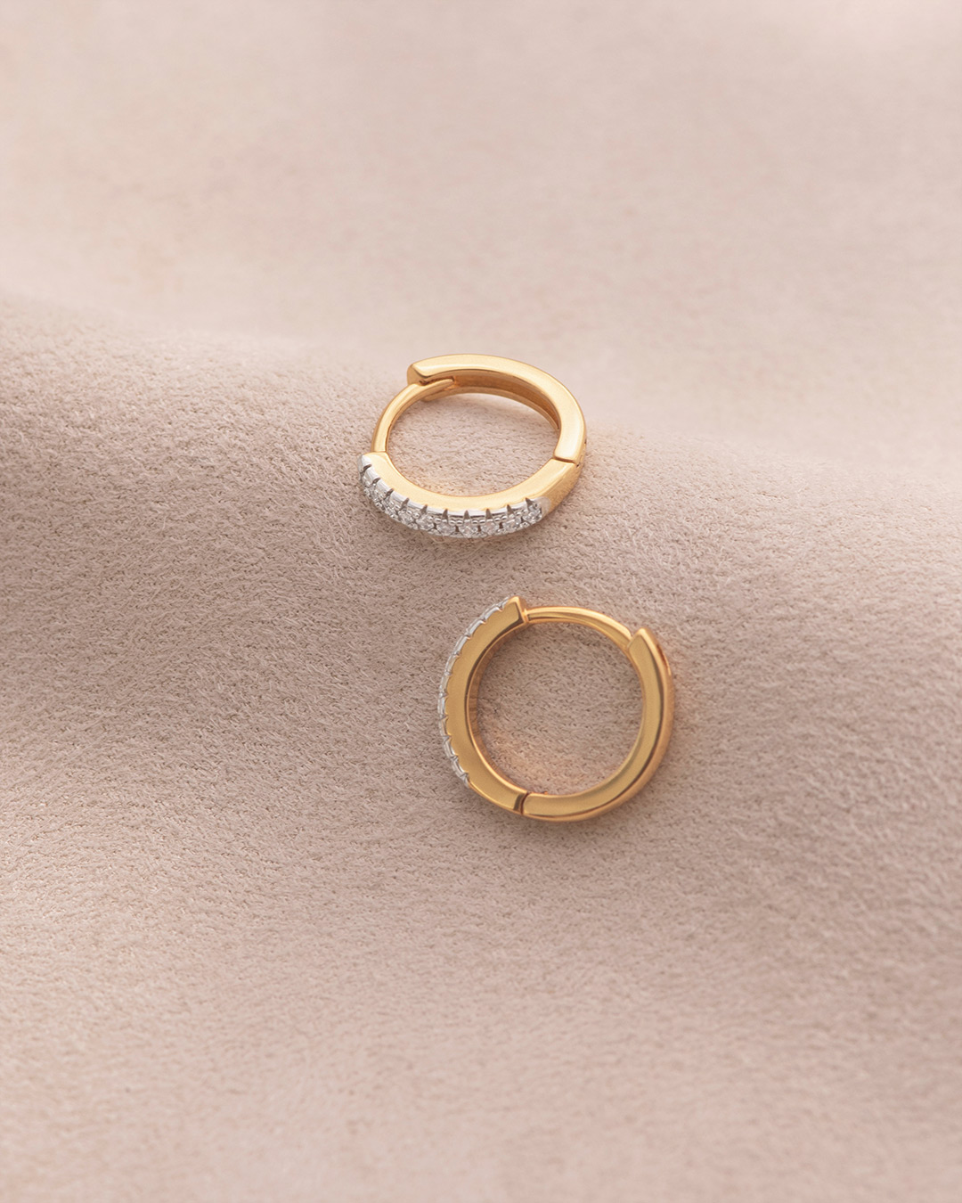 A smooth gold hoop finished with a neat row of small stones along one side. The contrast between polished gold and soft sparkle keeps the look balanced. These hoops are simple enough for everyday use while still adding a touch of brightness.