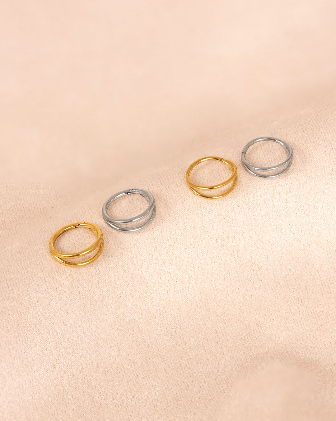 A versatile hoop with a unique design, the part that passes through the piercing is a single smooth band, while the front features a double-layered look. This creates the illusion of wearing two hoops in one. Lightweight and polished, it can be worn as a helix earring or as a stylish nose ring.