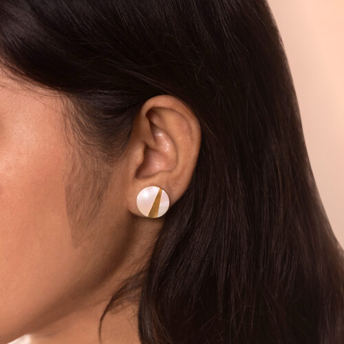 A round pendant and stud earrings crafted with luminous shell detailing, divided by a sharp gold-toned line that cuts through the surface like a beam of light. The contrast between soft pearly sheen and structured metal creates a modern, graphic look. Simple in shape but thoughtful in detail, this set pairs easily with everyday wear while still feeling intentional.