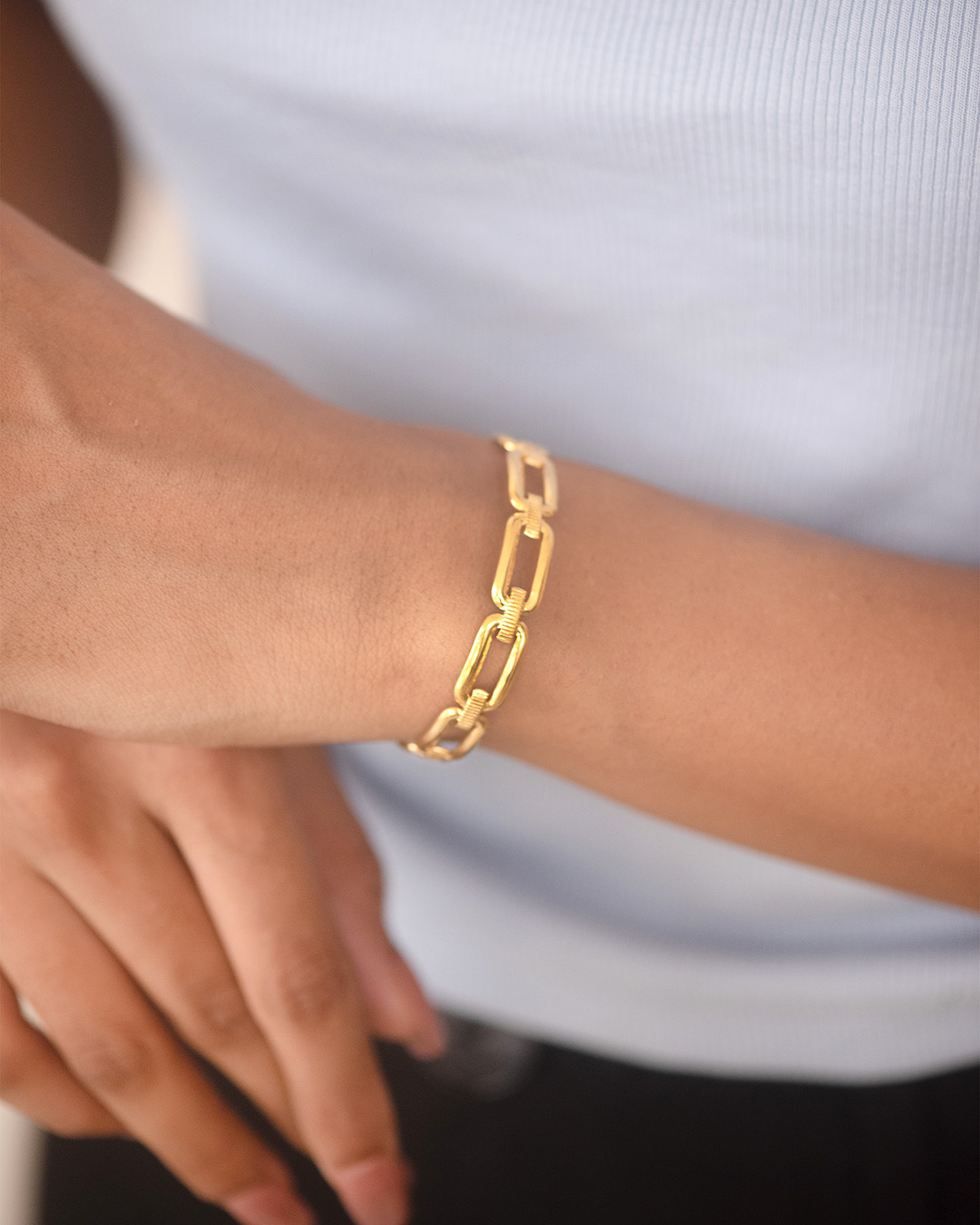 A chain bracelet made of smooth, rectangular links with a balanced weight. Each link connects with ease, forming a steady rhythm around the wrist. It carries a clean, confident look that pairs easily with anything, day or night.