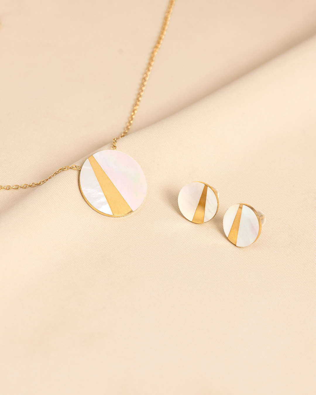 A clean, modern set featuring round mother-of-pearl discs accented with a sleek silver diagonal inlay. The necklace carries a larger, light-catching disc, while the matching studs offer a smaller, polished touch. Simple, bright, and perfect for everyday wear.