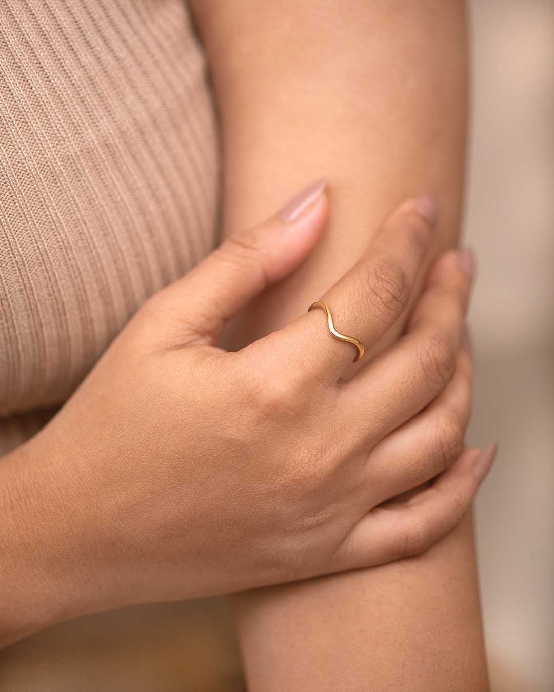 A softly curved gold band with a gentle, uneven line that catch the light as you move. Simple, fluid, and perfect for everyday wear.