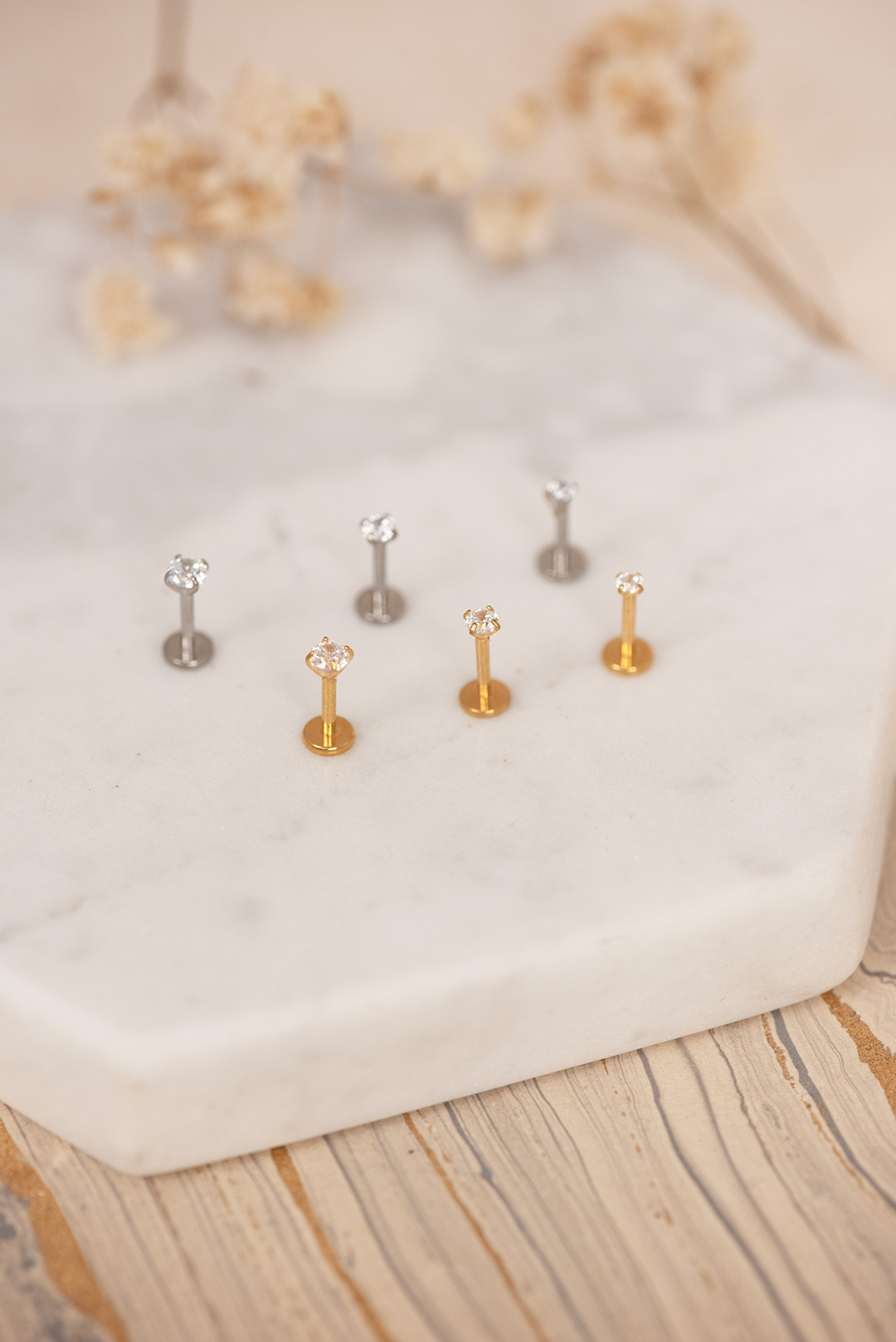 A tiny stud with a single round clear stone set at the front. Its clean design makes it versatile, perfect for the main lobe, upper lobe, helix, other upper ear piercings, or worn as a subtle nose pin.