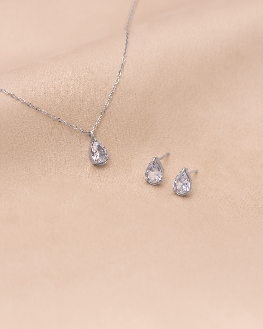 A delicate teardrop stone set in a smooth frame, paired with matching studs. The clean design allows the stone to catch the light beautifully, creating a bright focal point that works effortlessly for special occasions.