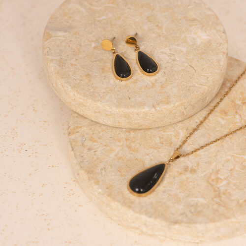 A sleek teardrop-shaped pendant and matching earrings featuring a smooth, deep black stone framed in gold. The elongated drop form creates a soft downward flow, while the polished surface gives it a bold, clean presence. Designed to sit close and move gently, this set feels striking yet balanced, perfect for days when you want something quiet but noticeable.
