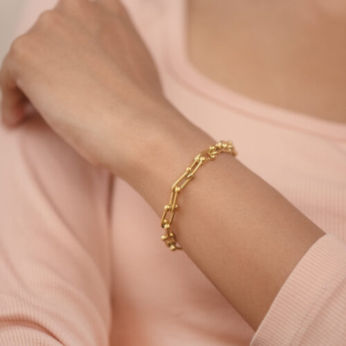 A sculpted, gold-toned bangle with a gentle rope twist that catches light as it moves. The surface flows in soft curves, giving a sense of quiet strength and motion. It feels warm and grounded, a piece that draws attention without trying to.
