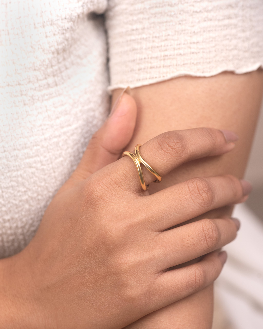 A sleek, open-band ring formed by two smooth curves that gently cross and wrap around the finger. Designed for everyday wear, this piece adds quiet character whether worn alone or stacked with other rings.