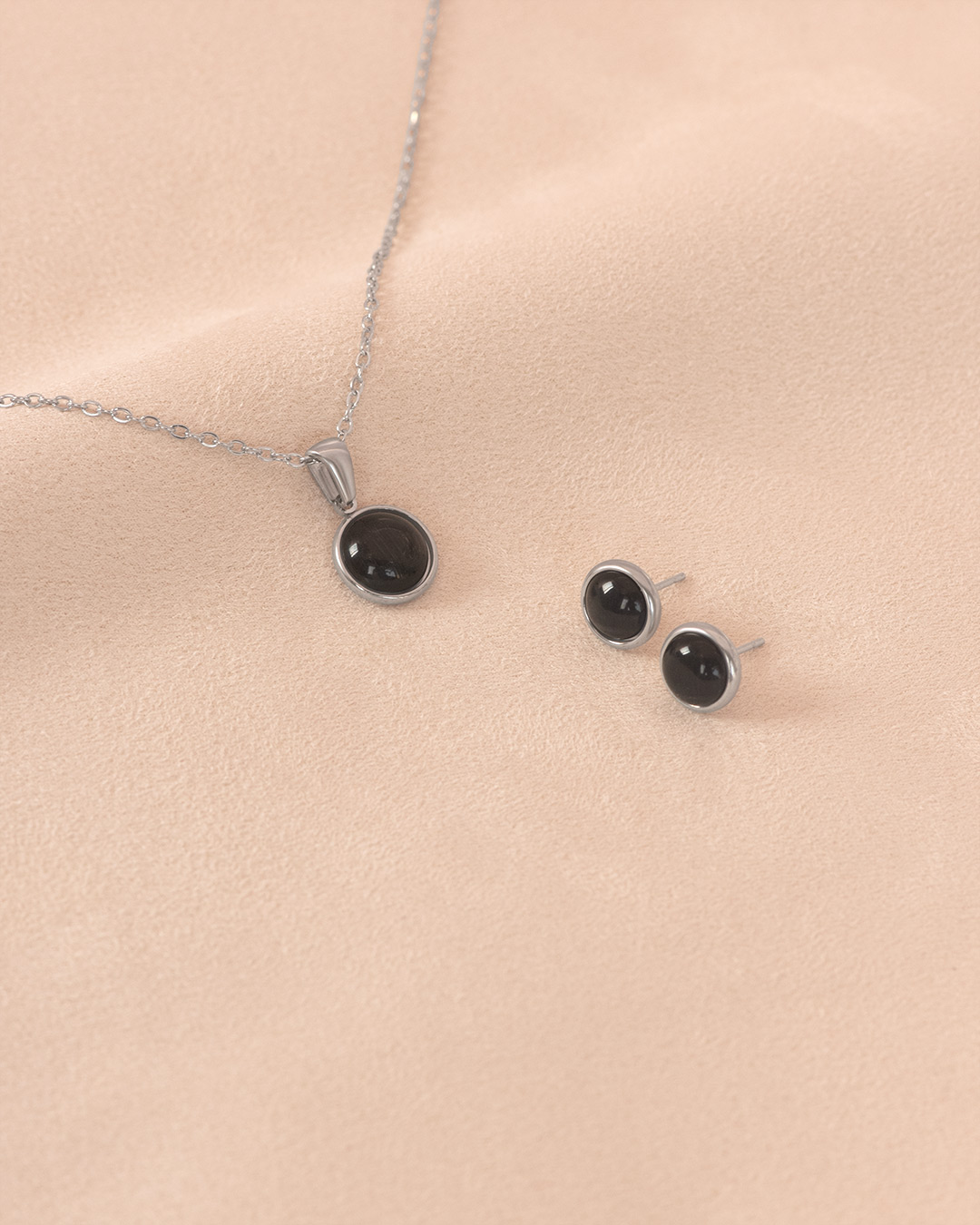 A sleek silver-toned necklace and stud set featuring smooth, round dark stones set in polished silver bezels. The necklace hangs from a delicate chain with a single circular pendant, while the matching stud earrings mirror the same simple yet bold design. The glossy black stones create a bold yet minimal look, making the set versatile for both everyday wear and evening outfits.