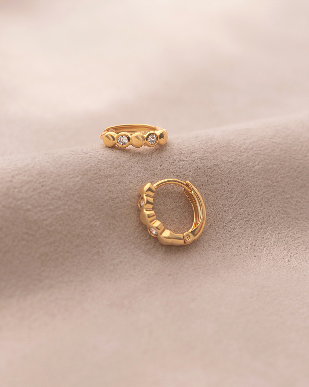 These small gold hoops feature a softly textured surface with tiny stones set evenly along the front. The raised detailing gives the hoops a gentle pattern, while the stones add a subtle shine that catches the light with every movement. The tiny size of the rhea hoops makes them sit almost flush against the ear lobes providing a sharp look.