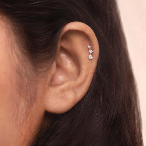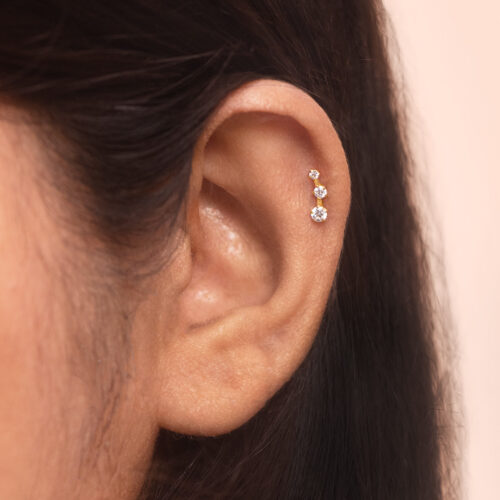A curved stud featuring three round stones arranged in a line. The top stone is the largest, followed by a medium-sized stone, and then the smallest at the end. Each stone is slightly spaced apart, creating a gentle curve that follows the shape of the piercing. Versatile in design, it can be worn on the upper lobe, helix and other upper ear piercings.
