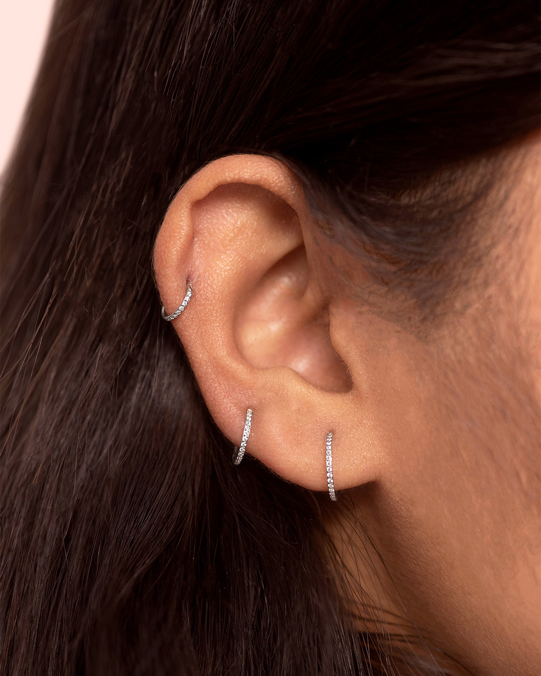 A refined hoop accented with tiny clear stones engraved along the curve. It adds just the right touch of shine to the main lobe, upper lobe, helix, other upper ear piercings, or when worn as a sparkling nose ring. Please check the size guide below to ensure you get your desired fit.