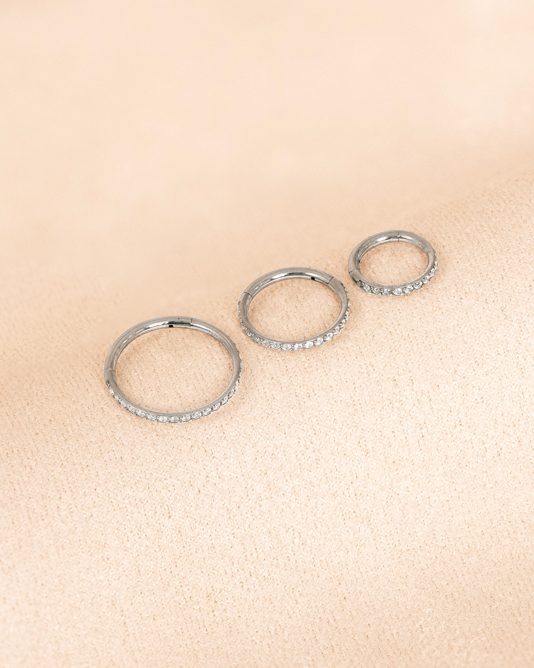 A refined hoop accented with tiny clear stones engraved along the curve. Whether worn on the helix or as a nose ring, it adds just the right touch of shine.